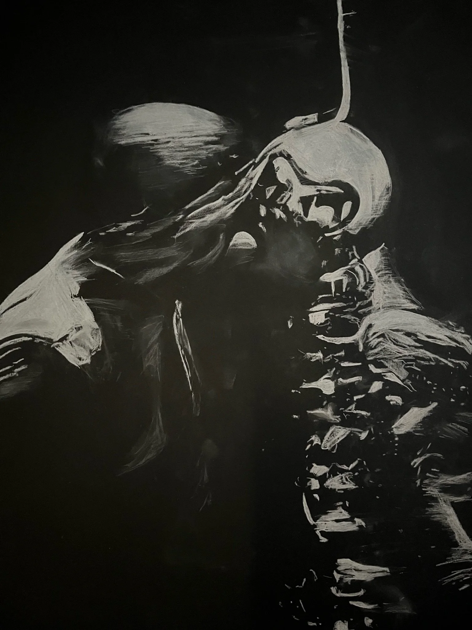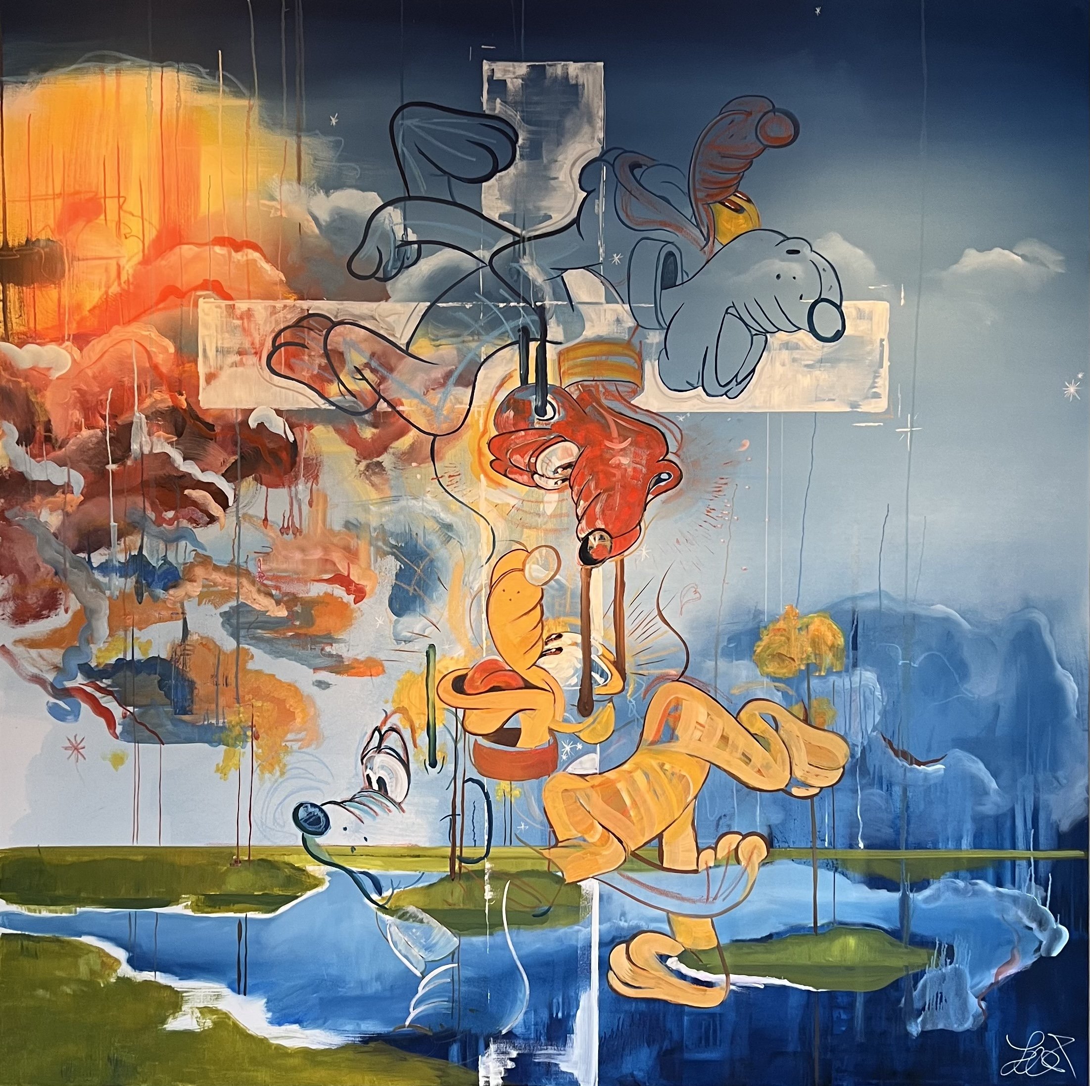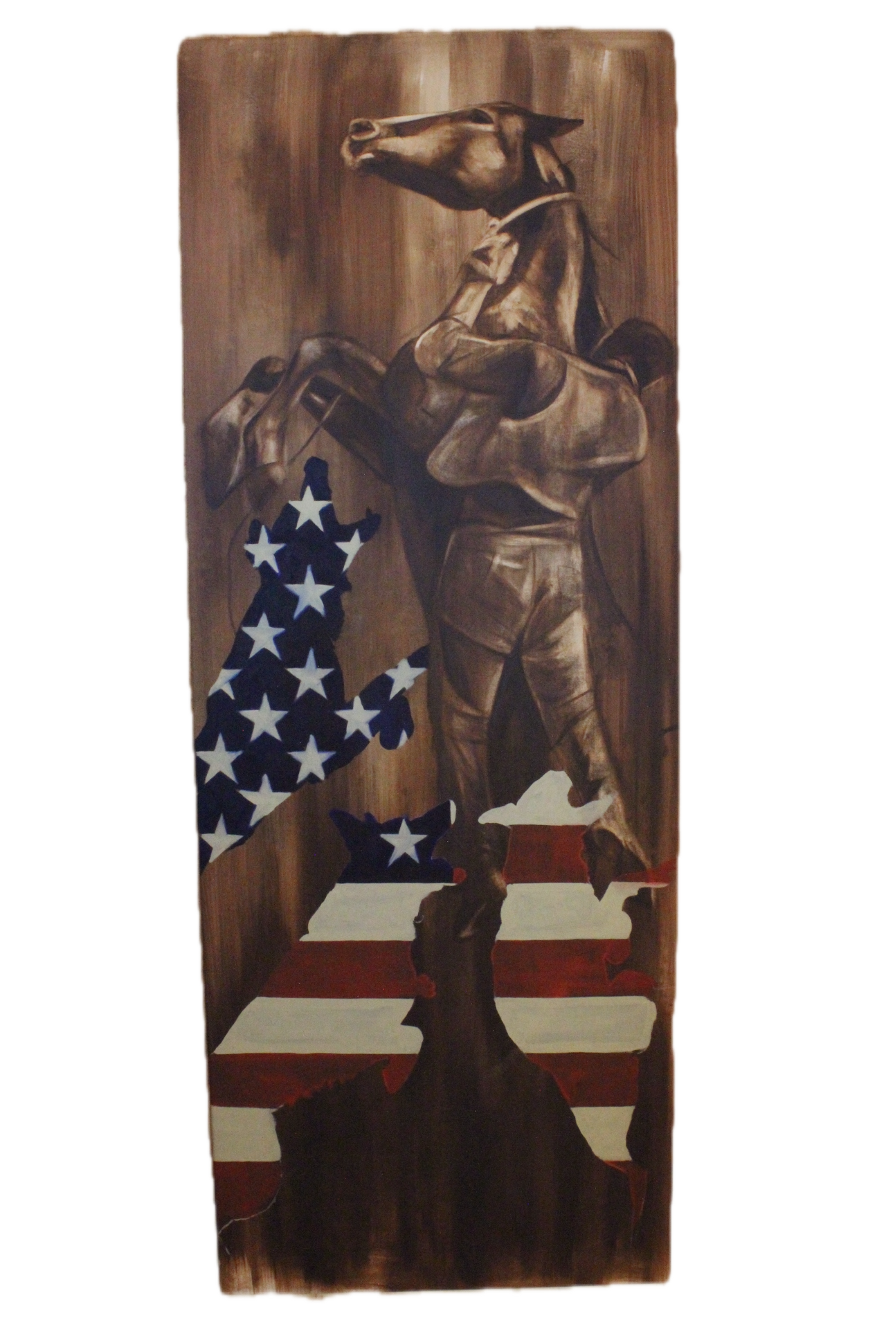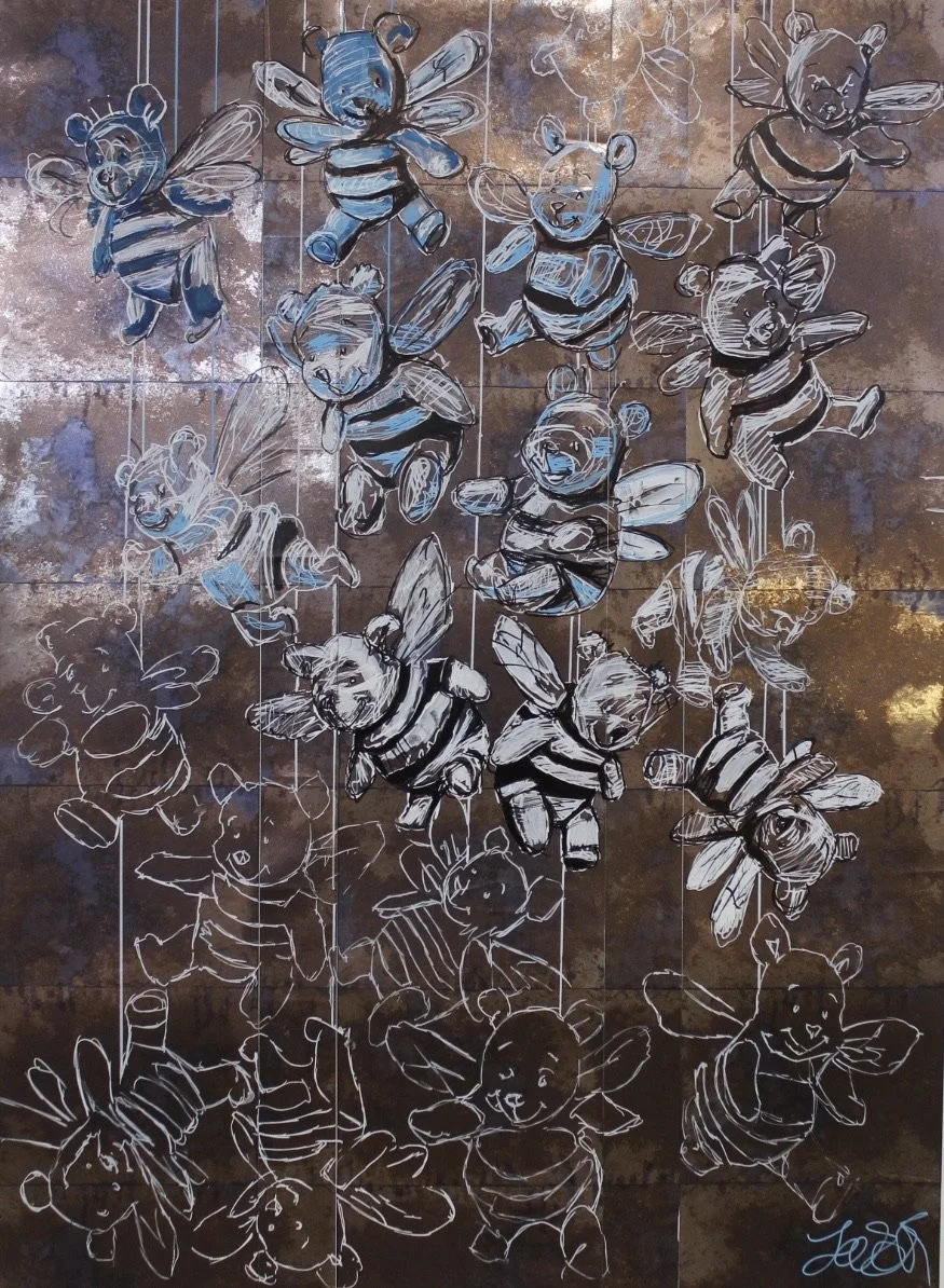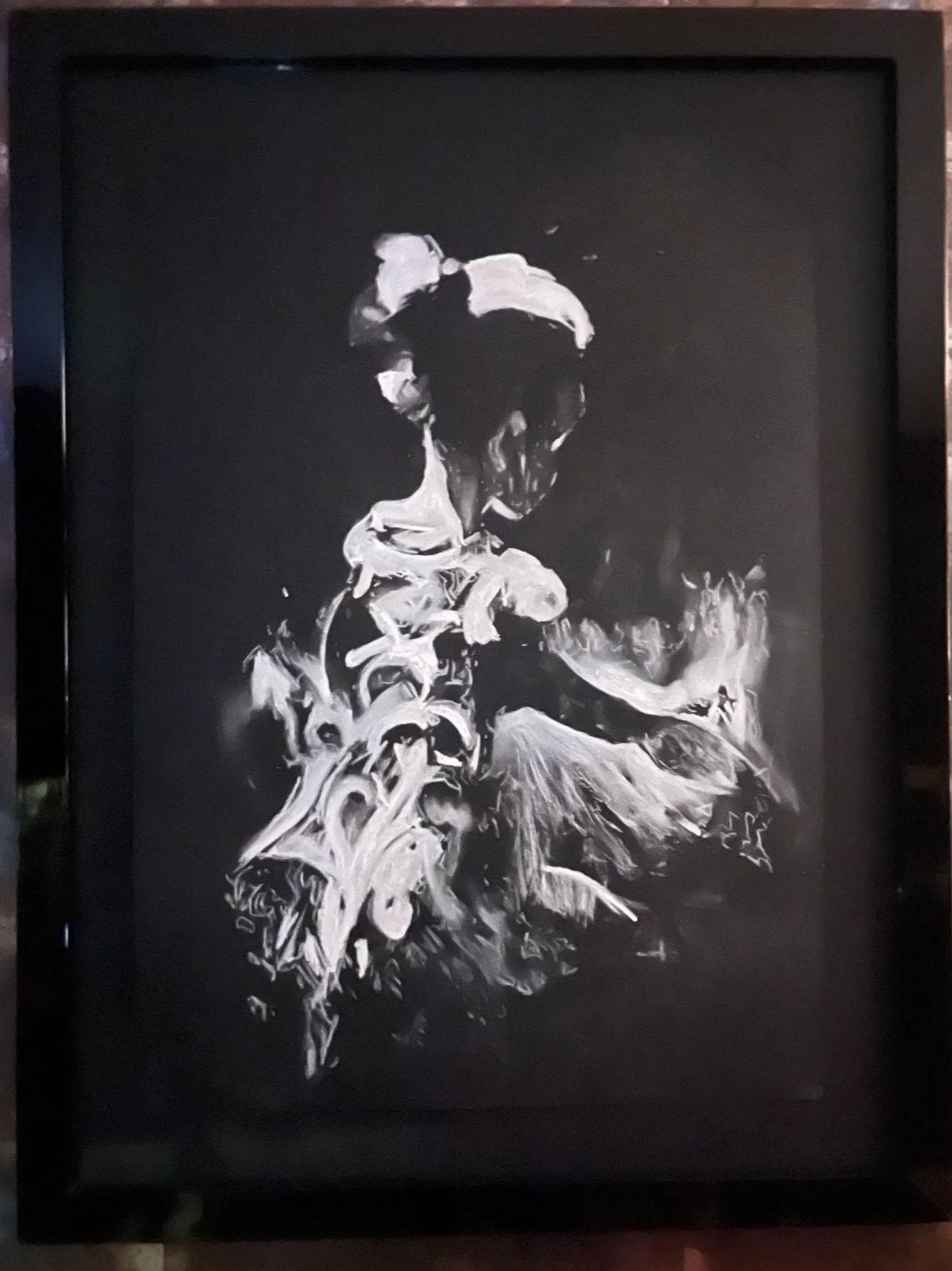 Acrylic, pastel, ink, and spay on paper. (framed)
